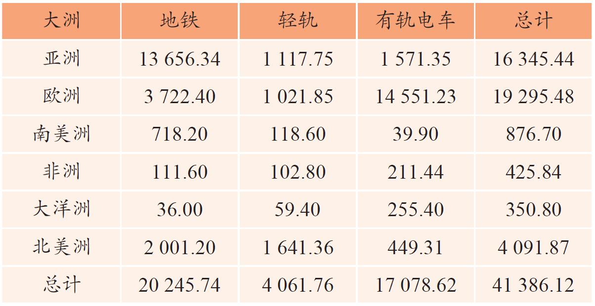 Το Σχήμα 1 δείχνει τη συνολική κλίμακα της αστικής σιδηροδρομικής διέλευσης μεταξύ μεγάλων ηπείρων στον κόσμο (Σημείωση: Όλες οι πόλεις στη Ρωσία ταξινομούνται στην Ευρώπη για υπολογισμό). Τα δεδομένα υποδεικνύουν ότι τα μετρό και τα τραμ είναι οι κύριοι τύποι αστικών σιδηροδρομικών μεταφορών παγκοσμίως, και η παγκόσμια αστική σιδηροδρομική διαμετακόμιση συγκεντρώνεται κυρίως στην Ευρασία, με τα μετρό να διανέμονται κυρίως σε ασιατικές χώρες.[1]