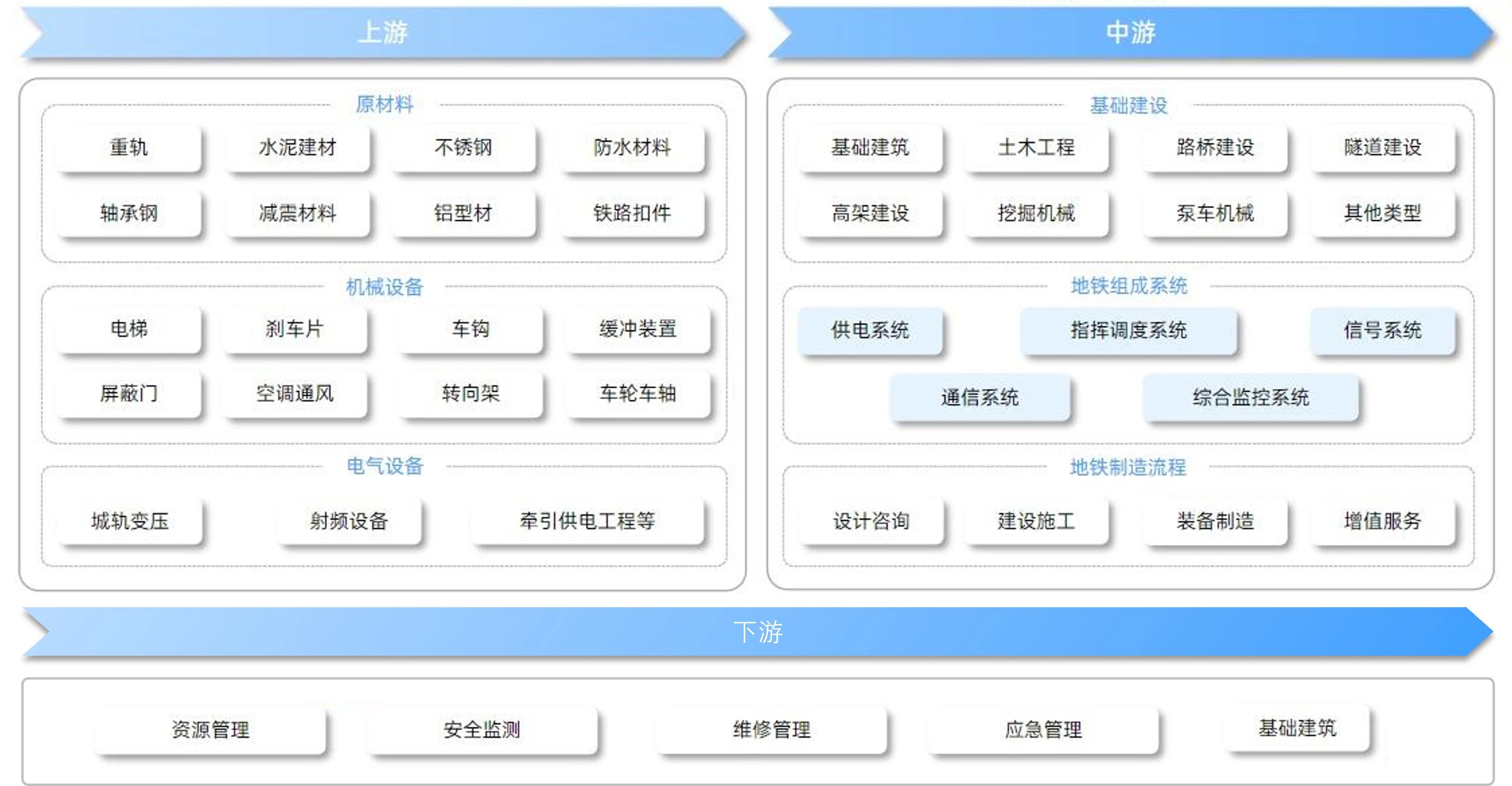 Η σιδηροδρομική διαμετακόμιση συνδέει τις αστικές βιομηχανίες, προωθεί την επέκταση της βιομηχανικής αλυσίδας και οδηγεί στην ταχεία ανάπτυξη υποστηρικτικών βιομηχανιών, όπως η κατασκευή εξοπλισμού και η τεχνολογική Ε&Α. Η αλυσίδα της βιομηχανίας του μετρό φαίνεται στο Σχήμα 3, όπου όλοι οι κρίκοι αλληλοεξαρτώνται και οδηγούν την οικονομική ανάπτυξη των αστικών οικισμών και των μητροπολιτικών περιοχών.[2]